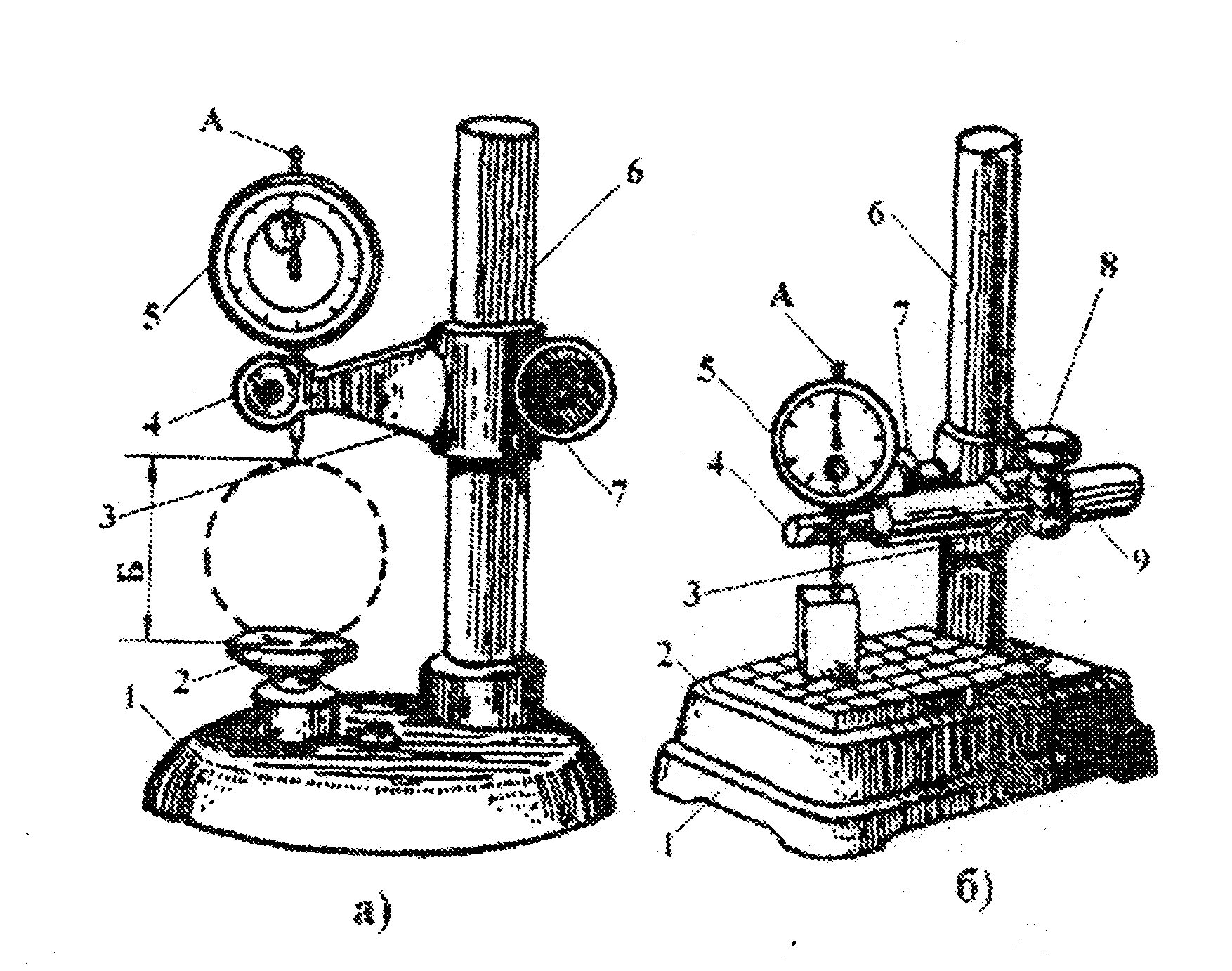 Стойки с индикатором служат для наружных измерений деталей. Стойки лёгкого типа с круглым столом рис. 3.8 а. и с квадратным столом Рис. 3.8 б. состоят из основания 1, стола 2, кронштейна 3, к которому винтом 4 крепится индикатор 5, колонки 6 и винта 7, фиксирующего положение относительно столика. У стоек с квадратным столом и кронштейна 3 крепится державка 9, которая может перемещаться вдоль хомута и фиксироваться винтом 8. При установке и удалении объекта измерения необходимо увеличивать размер Б путем подъема измерительного стержня за головку А.