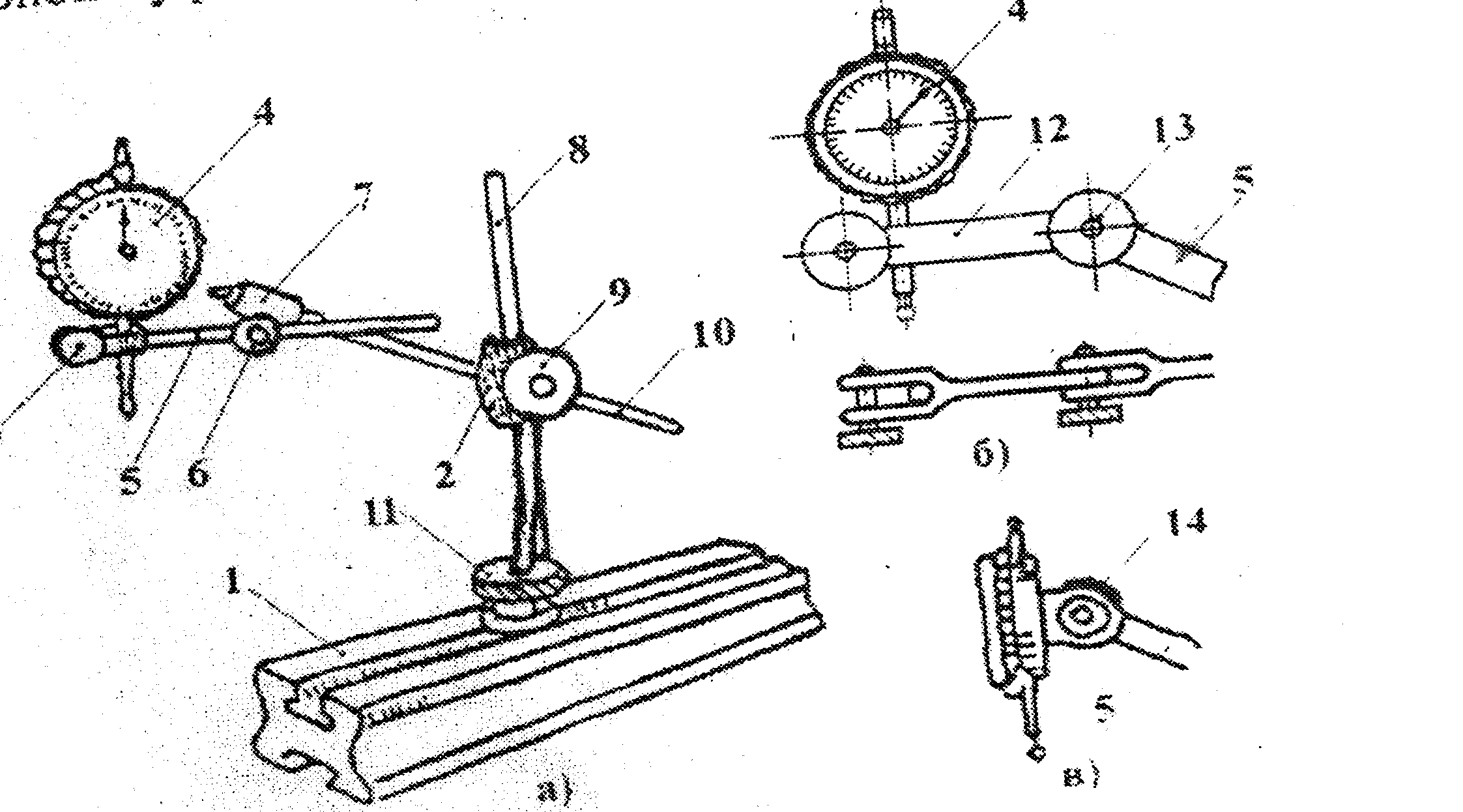 В пазу основания 1 (рис. 3.4 а.) перемещается сухарь, в котором закреплена стойка 8, фиксируемая гайкой. Со стойкой при помощи разрезной муфты 2 соединен стержень 10, который можно устанавливать под любым углом к стойке 8, перемещать в муфте вдоль своей оси и поворачивать вокруг неё. Положение стержня 10 относительно стойки 8 фиксируется гайкой 9. Индикатор крепят или на стержне 5 или на серьге 12 (рис. 3.4б.) В этом и другом случае гильзу индикатора зажимают винтом 3. Стержень 5 соединяют со стержнем 10 муфтой 7, которую затягивают гайкой 6. Серьгу 12 скрепляют со стержнем 5 и фиксируют гайкой 13. Если индикаторная головка имеет ушко, то её соединяют прямо со стержнем 5 и фиксируют гайкой 14 (рис. 3.4 в). Серьгу 12 при этом снимают.