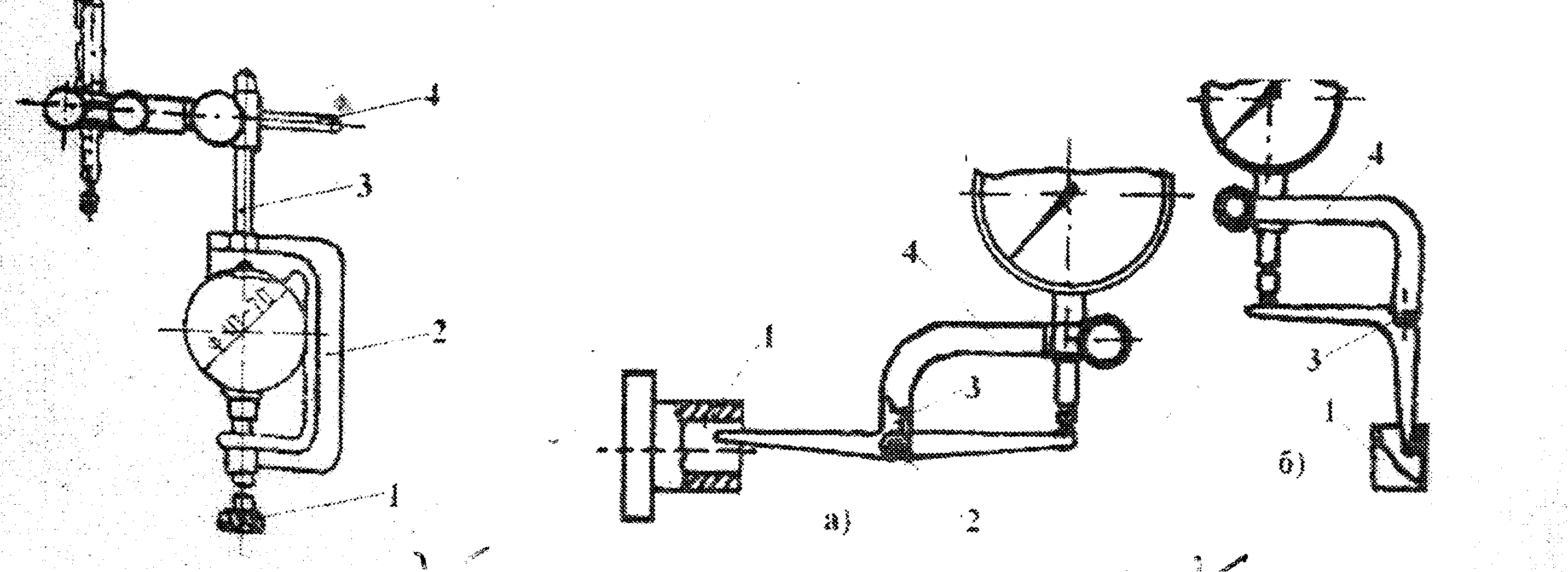 На рис. 3.6. показано применение струбцины 2 со стойкой 3 и хомутом 4 с индикаторной головкой для проведения измерений на изделии. При невозможности выполнить измерения по вышеприведенной схеме используют двуплечие рычаги – прямой рис. 3.7 а и угловой рис. 3.7 б.