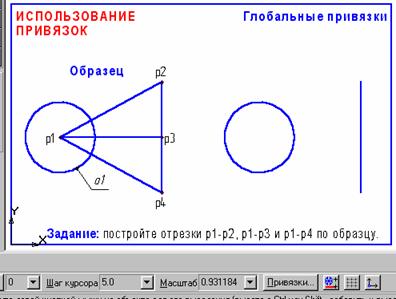 Задание: постройте три отрезка р1 – р2, р1 – р3 и р1 – р4 по образцу. Начальные точки отрезков лежат в центре окружности 01, а конечные в начале, в середине и в конце отрезка р2 – р4 соответственно, рис. 1.12.
