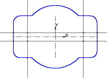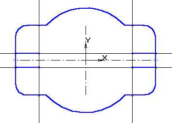 7. Выполните пазы. Для этого постройте с помощью параллельных вспомогательных прямых параметры пазов – ширину паза и положение центров цилиндрической поверхности пазов, рис. 1.29.