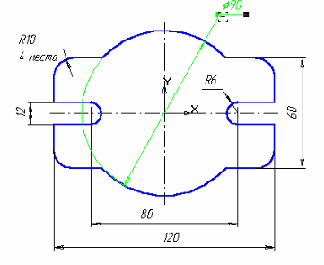 9. Проставьте необходимые размеры. В процессе простановки диаметра окружности равного 90 мм остается тонкая размерная дуга. Для ее удаления щелкните мышью на размерной линии, поместите курсор на узел, определяющий начало полки. Нажмите левую кнопку мыши и, не отпуская ее, переместите курсор немного выше, рис. 1.32.