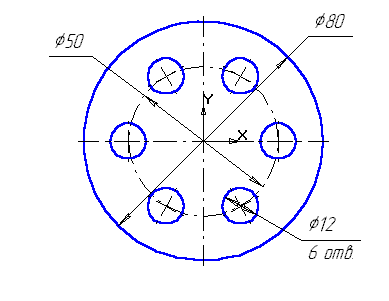 2. Начертите две концентрические окружности: одна основной линией с отрисовкой осей радиусом 40 мм, другая окружность осевой линией без отрисовки осей радиусом 25 мм. Постройте окружность основной линией с осями радиусом 6 мм.