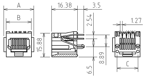 Для TJ3-6P4C А=16 мм, В=13,5 мм, С=10,2 мм.