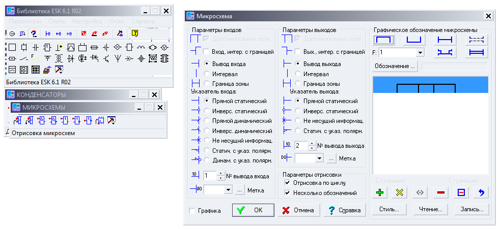 2. Для получения УГО микросхем используется режим отрисовки. (рис. 7.4). В ней задается параметры левых и правых выводов.