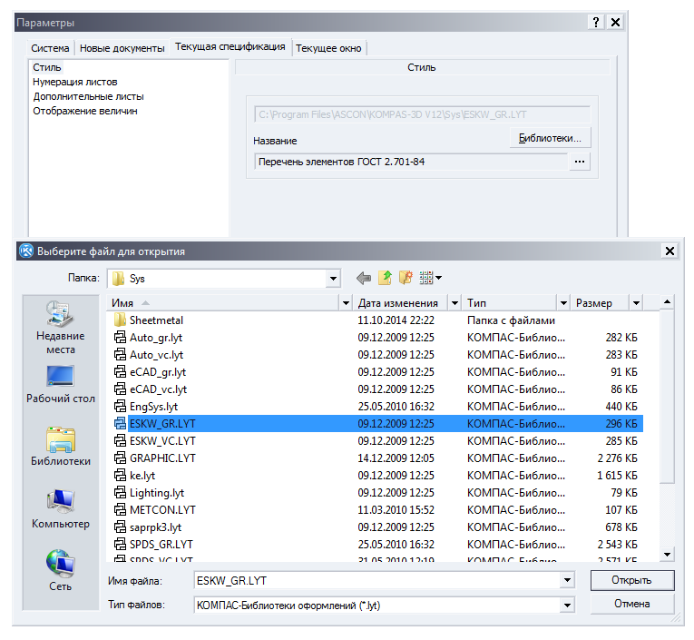 1. Необходимо создать новый документ- Спецификация. И в этом документе изменить стиль. Меню Сервис-Параметры. Выбрать вкладку Текущая спецификация стиль. Нажать кнопку Библиотеки и выбрать ESKW_GR.LYT (рис. 8.1) .