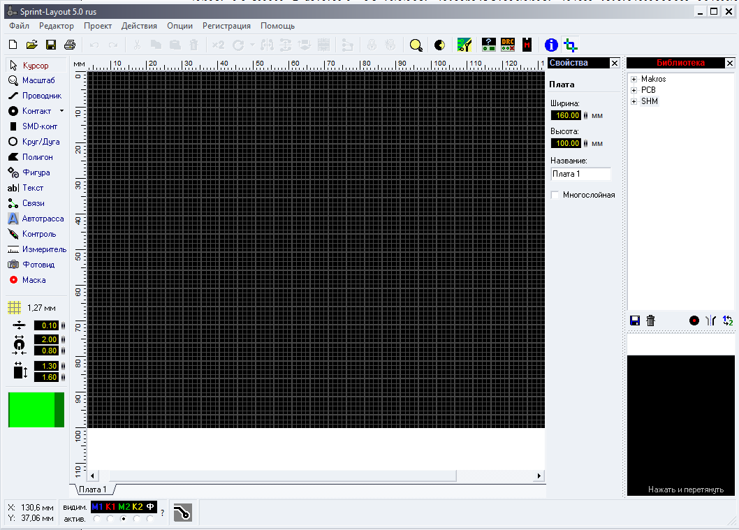 Слева на вертикальной панели расположены кнопки отрисовки посадочных мест компонентов, проводников и других элементов. Справа панель задания размеров платы и библиотека встроенных посадочных мест. Внизу панель переключения слоев: М1-фольга с одной стороны, К1-шелкография с этой же стороны; М2-фольга с другой стороны, К2-шелкография с этой же стороны