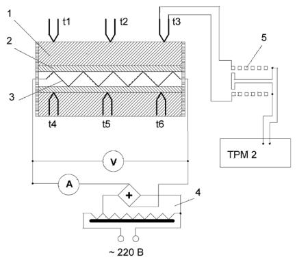 Температура внутренней поверхности образца измеряется тремя (хромель-копель) термопарами t1, t2 и t3, а наружной – термопарами t4, t5 и t6 одной и той же