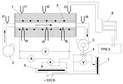 раствор после затвердевания и длительной осушки). Снаружи на рабочий узел намотан электронагреватель 5 из нихромовой проволоки. Температура наружно поверхности трубы измеряется термопарами t1, t2 и t3, температура внутренней поверхности - термопарами t4, t5 и t6.