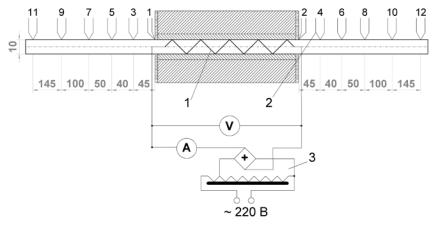 стержня tx, °С, измеряется с помощью 12 хромель – копелевых термопар 2, приваренных к стержню на разных расстояниях (в мм) друг от друга.