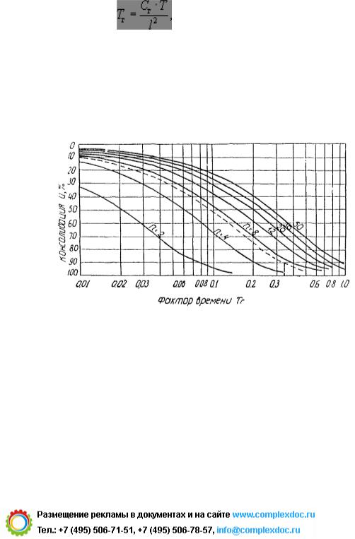 ж) по графику зависимости степени консолидации от фактора времени находят степень консолидации при вертикальной фильтрации воды из грунта основания (см. рис. 40 - 41)