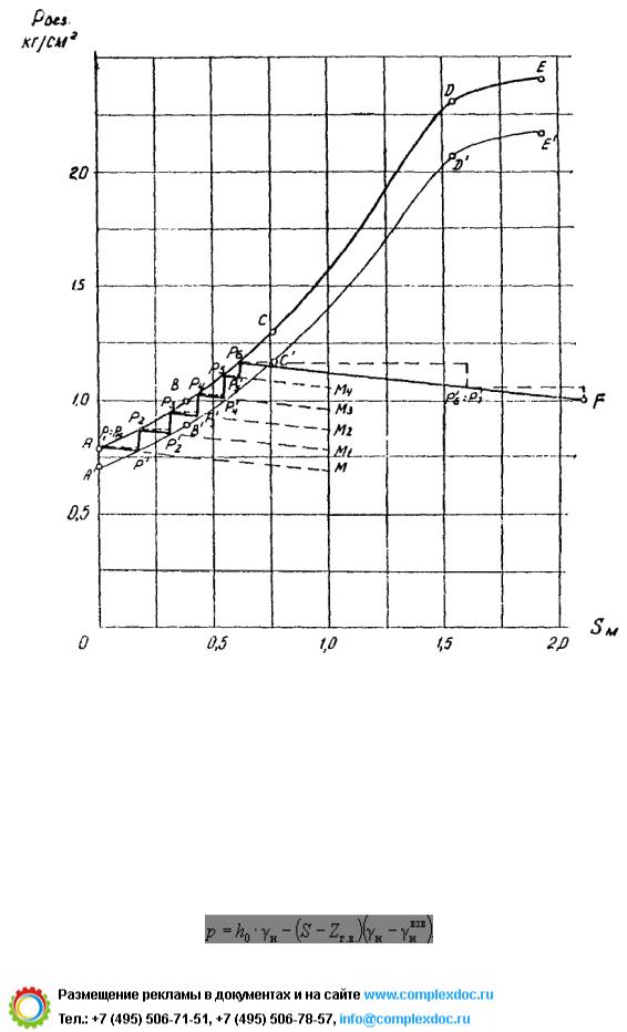 Поскольку мы считаем, что в момент завершения отсыпки насыпи нагрузка на основание должна равняться безопасной, проведенную линию продолжаем до пересечения с кривой рбез = f(S) в точке р6. Отрезок р6F представляет собой конечный участок искомой фактической зависимости нагрузки от осадки при наиболее рациональном режиме загружения.