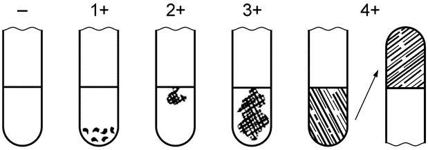 4+ все содержимое пробирки скоагулировано и не меняет своего положения при переворачивании пробирки.