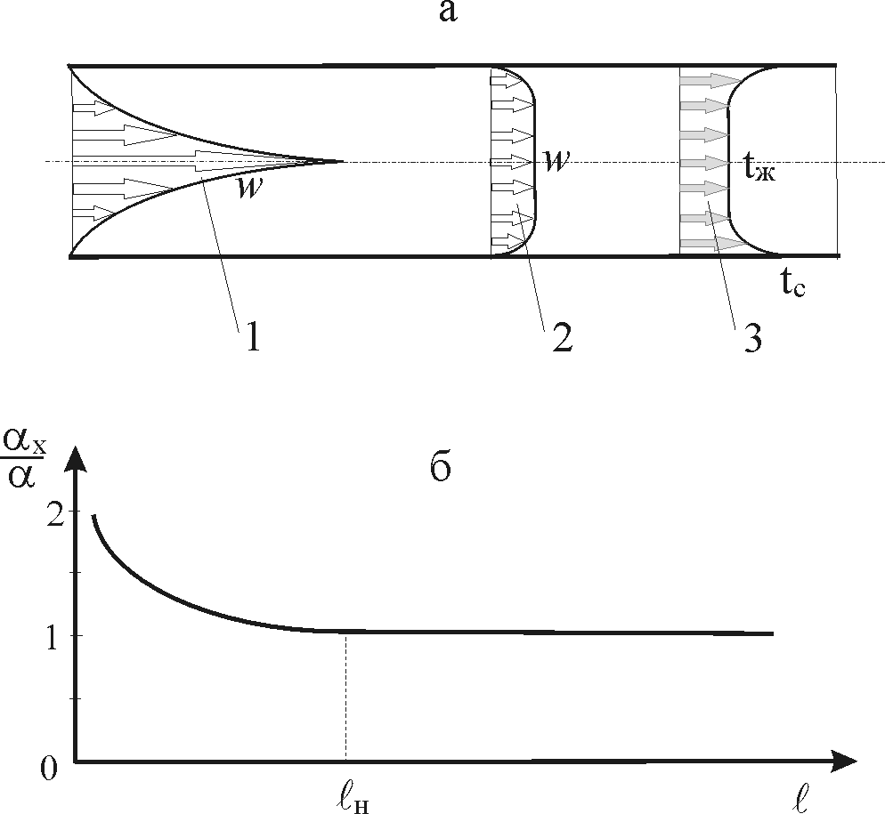 Таким образом, на начальном участке трубы будет формироваться пограничный слой. После участка гидродинамической стабилизации ℓн пограничный слой заполняет все поперечное сечение трубы. Скорость движения и температура потока жидкости принимают практически постоянные значения по сечению потока.