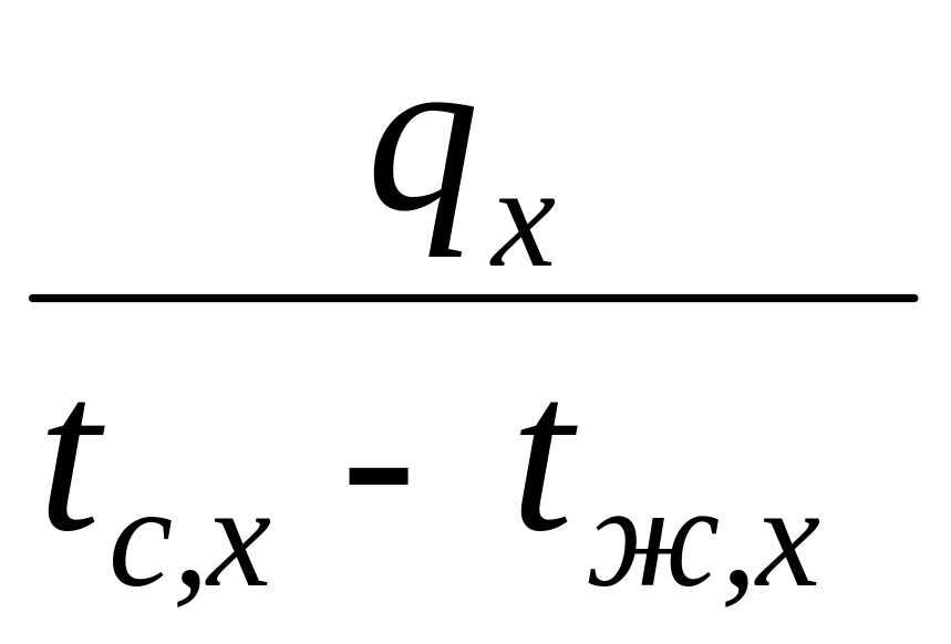 где qх – плотность теплового потока от поверхности твердого тела к потоку жидкости в заданном сечении х; tс,х , tж,х – температуры стенки и жидкости в заданном сечении.