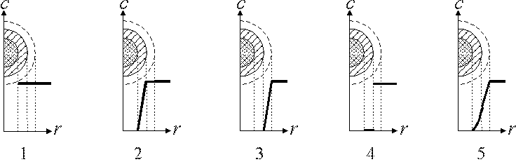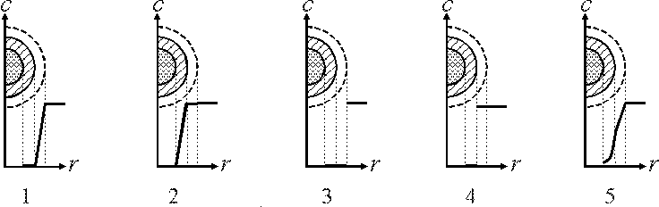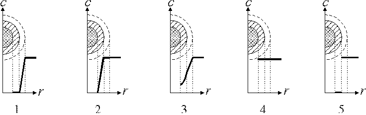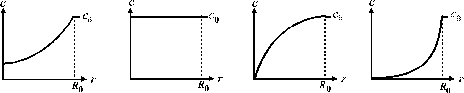 3.1.3. Какие из представленных графиков отображают распределение концентрации газообразного реагента A вокруг и внутри твердой частицы для гетерогенного процесса "газ – твердое", протекающего во внутридиффузионной области? 2