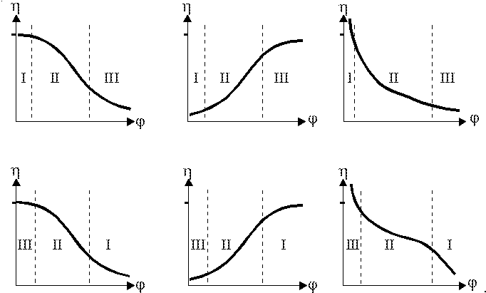 3.2.5. Для процесса на пористом зерне катализатора правильно выбрать графическую зависимость степени использования внутренней поверхности от параметра Зельдовича-Тиле и области протекания процесса (I – кинетическая область; II – переходная область; III – внутридиффузионная область):