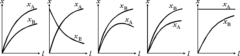 4.3.6. Как изменяются степени превращения реагентов А и В по длине реактора вытеснения для реакции А + В = R + S (реагент В взят в некотором избытке, начальные концентрации R и S равны 0)?