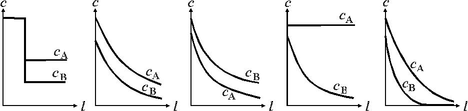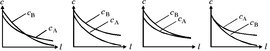 4.3.7. Как изменяются по длине реактора вытеснения концентрации исходных реагентов в реакции А+В→R+S (реагент А взят в некотором избытке, начальные концентрации R и S равны 0)?