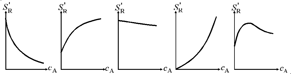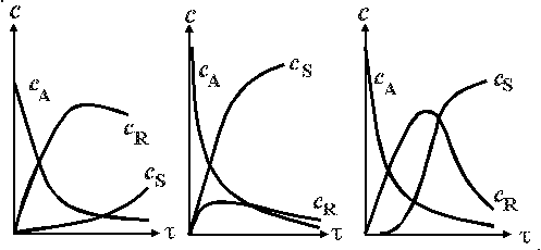 4.3.10. Протекает последовательная необратимая реакция типа А R S. Изменение концентраций реагентов во времени характеризуется кривыми сA, сR, сS.