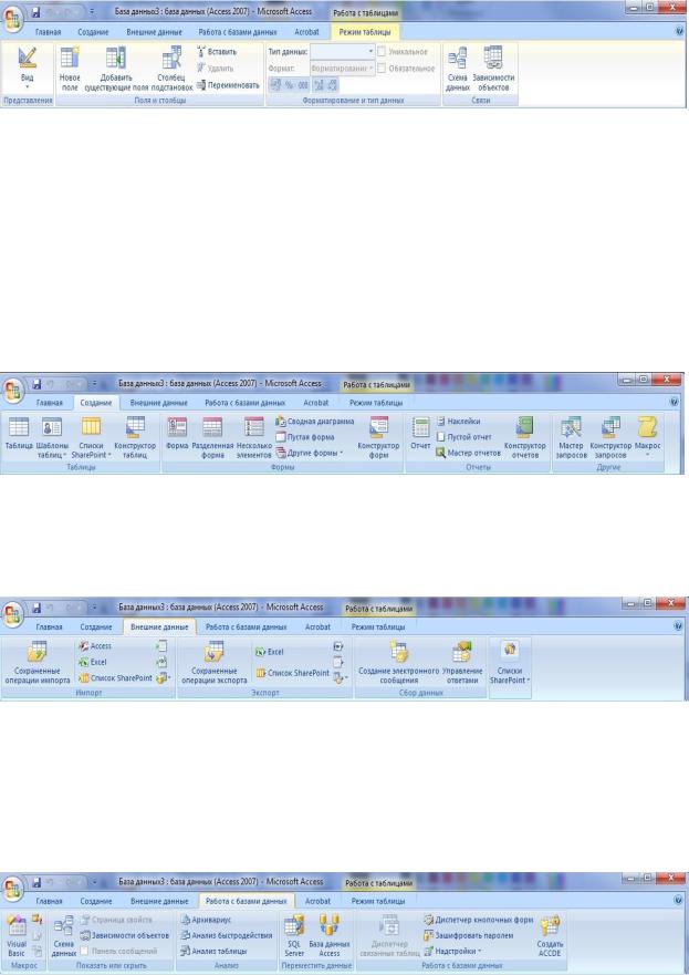 Работа с базами данных. Команды, помещенные на этой вкладке, обеспечивают поддержку созданных баз данных, а именно доступ к макросам, а отображение-сокрытие различных элементов баз данных, перемещение данных, а также другие операции в рамках поддержки баз данных (рис. 4.8).