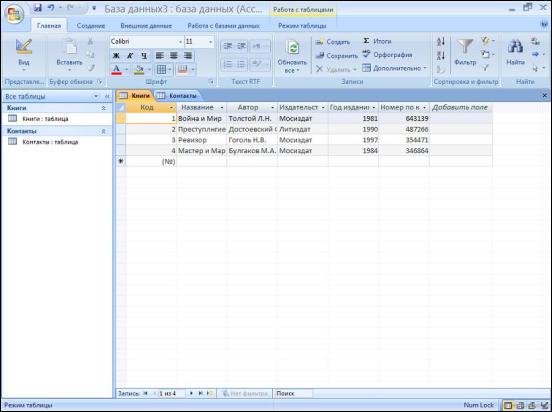 Если теперь вернуться в режим таблицы: Вид > Режим таблицы, то можно заполнить полученную таблицу данными, изменить ее название ( В качестве примера таблица названа «Книги» и содержит данные по известной литературной классике) (рис. 4.17).