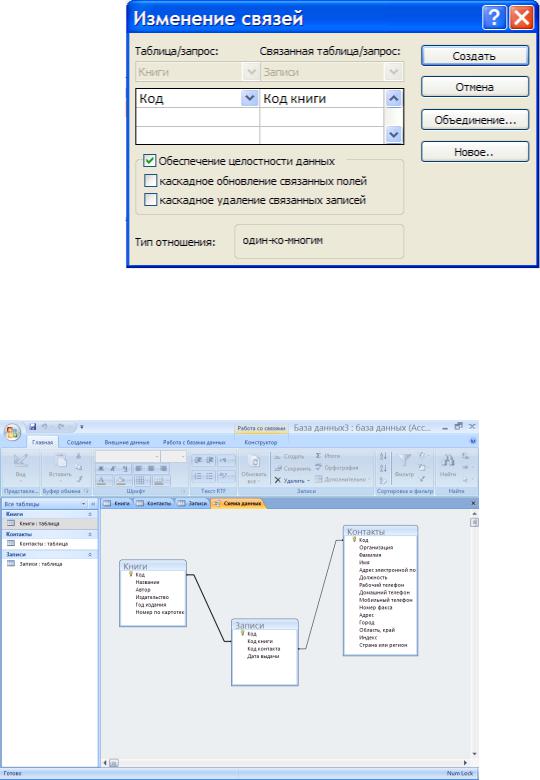 Установка флажка Каскадное удаление связанных записей приведет к тому, что при удалении записи одной таблицы («Книги») будут удалены все соответствующие записи таблицы связей («Записи»). Если указанный флажок сброшен, удаление тех записей таблицы, на которые ссылается хотя бы одна запись другой таблицы, запрещено (рис. 4.20).