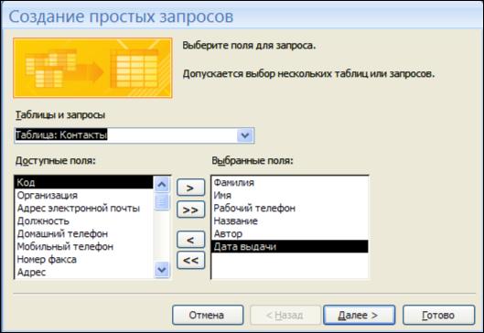 Чтобы упростить задачу пользователя, в состав Access включен мастер запросов, позволяющий автоматизировать процесс построения запроса. Для создания запроса переходим на вкладку «Создание» и нажимаем кнопку «Мастер запросов», выбираем «Простой запрос» и нажимаем ОК. В раскрывающемся списке «Таблицы и запросы» выбираем необходимую нам таблицу (в примере «Контакты»), и выбираем поля из списка «Доступные поля». Этот выбор определяет, по каким полям можно будет производить поиск в созданной базе данных. Нажатие кнопки «Далее» продолжит работу с конструктором (рис. 4.22).