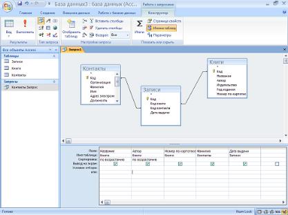 Мастер запросов умеет конструировать только простые условия отбора. Чтобы наложить дополнительные ограничения, следует пользоваться конструктором запросов, обеспечивающим полное управление параметрами запроса и построение сложных условий отбора данных. Запуск конструктора запросов производится путем нажатия кнопки «Конструктор запросов» на вкладке Создать. При этом открывается окно «Добавление таблицы», в которое необходимо добавить все таблицы, которые должны участвовать в запросе. Итогом создания запроса с помощью конструктора станет таблица запроса, которая будет содержать в себе схему связи между таблицами базы данных и полями, которые можно выбрать для отображения в запросе (рис. 4.24).