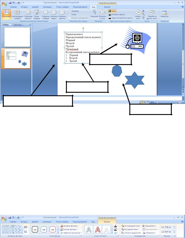 1.Используя ленту инструментов вкладки «Вставка» вставьте в слайд надпись, картинку, рисунок, автофигуру;
