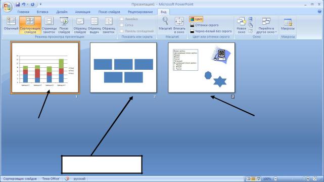 Для управления показом слайдов презентации в Ms PowerPoint есть специальный режим просмотра – "Сортировщик слайдов" (Рис. 5.4). В этом режиме содержимое слайдов не редактируется и показано в виде эскизов.