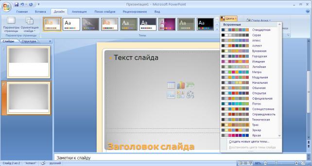 Кнопка "Цвета" панели Темы (Рис. 5.5) позволяет пользователю применить к одному или сразу ко всем слайдам презентации однотипное, стандартное или специальное цветовое решение, которое можно легко менять.