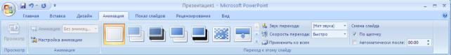 За смену слайдов отвечает вкладка "Анимация" (Рис. 5.6). В этом окне можно выбрать различные анимационные эффекты смены слайдов; обозначить продвижение от слайда к слайду (по щелчку – это щелчок левой клавишей "мыши", нажатие на стрелку вправо, пробел или Enter; автоматически – по истечении времени); определить звуковой эффект смены слайдов.