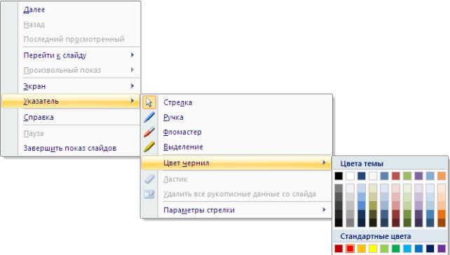 С помощью этого меню можно управлять ходом презентации ("Далее", "Назад", "Перейти к слайду", "Завершить показ слайдов"), изменять указатель со стрелки на перо ("Указатель" – "Цвет чернил"), убирать рисунки, сделанные пером ("Экран"), переключаться в режим черного экрана ("Экран" – "Черный экран") и т.д.