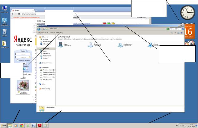 деле это чаще всего ярлыки-указатели. Ярлык – особый тип значка. В левом нижнем углу такого значка присутствует изогнутая стрелка. Ярлык обеспечивает быстрый доступ к объекту непосредственно с рабочего стола. Тогда рабочий стол может выглядеть, например, так (рис. 1.1.). На рабочем столе также открываются рабочие окна программ. Фоном рабочего стола можно сделать любую картинку.