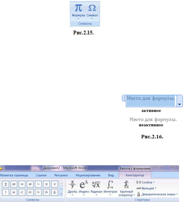 На листе документа появиться окошко – Место для формулы (рис.2.16.). Когда окошко активно (выделено) на Ленте