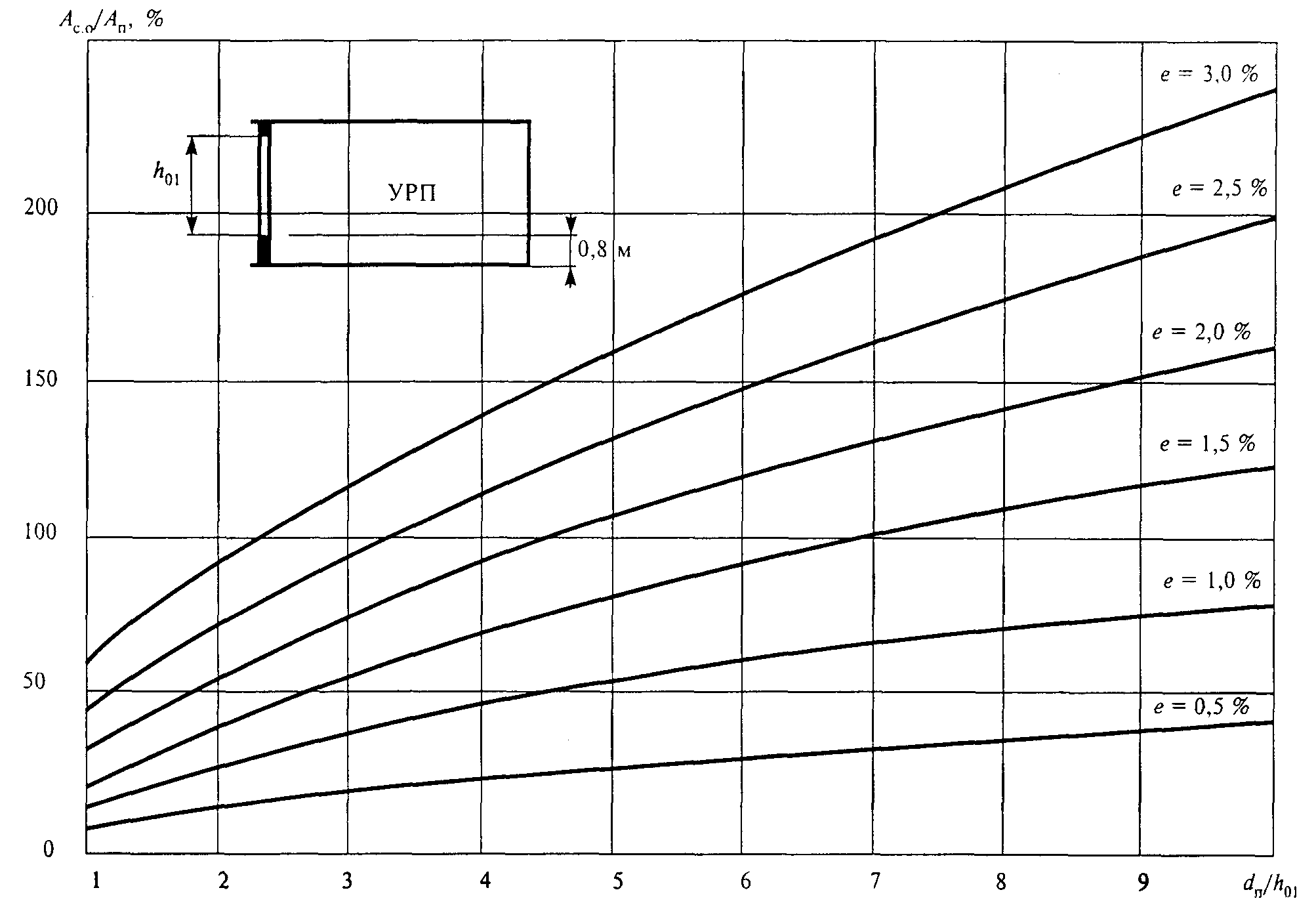 в) на оси абсцисс графика (рисунок 1) определяют точку, соответствующую определенному значению dп/h01, через найденную точку проводят вертикальную линию до пересечения с кривой, соответствующей нормированному значению КЕО. По ординате точки пересечения определяют значение Ас.о/Ап;