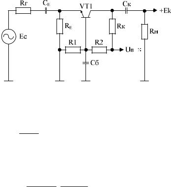 Робоча схема каскаду СБ наведена на рисунку 6. За змінним струмом спільною точкою вхідного (емітерно-базового) і вихідного (колекторно-базового) ланцюгів є база, яка заземлена через конденсатор Cб . Робочий режим за постійним