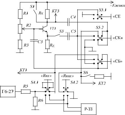 конденсатор С4 (каскад зі СЕ) або через С5 (каскад із СК) підключається до виходу досліджуваного каскаду. На платі модуля є контрольні точки КТ1 - KT3 для спостереження форми сигналу в характерних точках схеми.