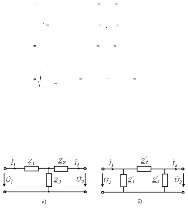 При определении коэффициентов четырехполюсника расчетным путем должны быть известны схема соединения и величины сопротивлений четырехполюсника. Как было отмечено ранее, пассивный четырехполюсник характеризуется тремя независимыми постоянными коэффициентами. Следовательно, пассивный четырехполюсник можно представить в виде трехэлементной эквивалентной Т - (рис. 2.3,а) или П - образной (рис. 2.3,б) схемы замещения.