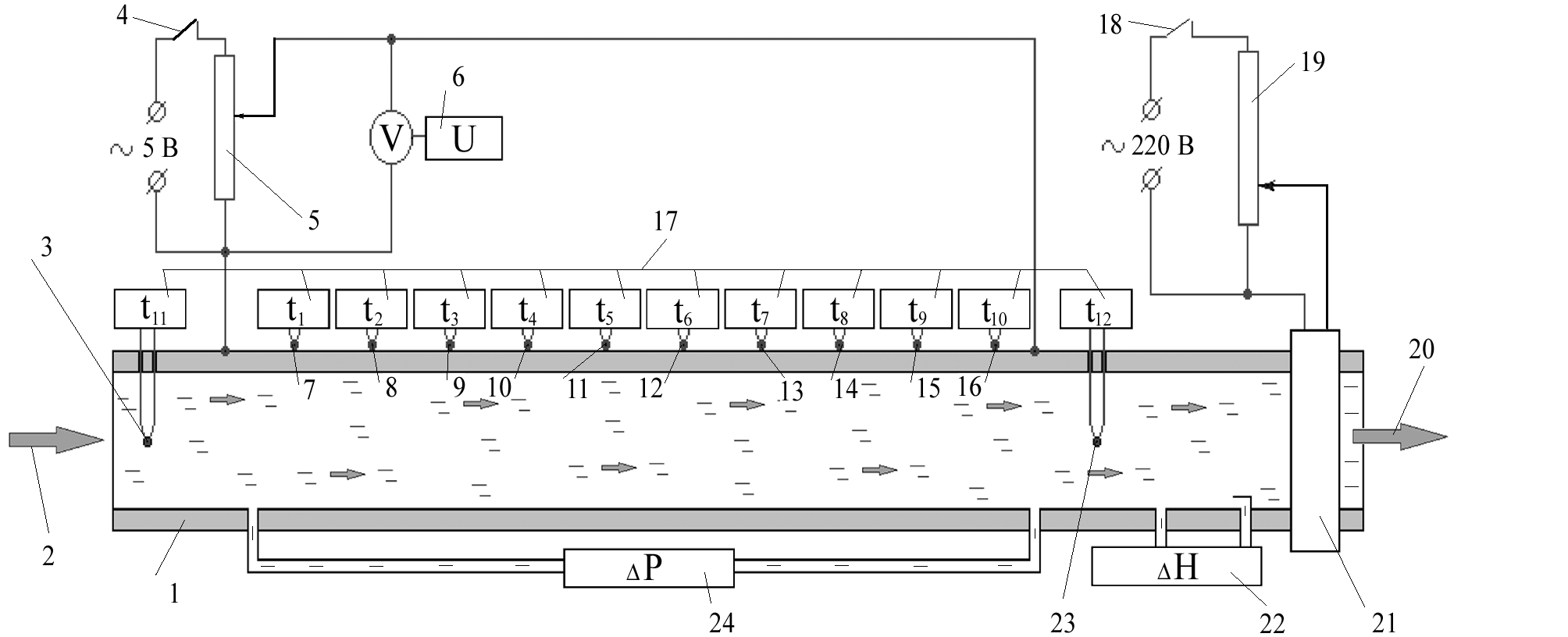 1 – опытная труба; 2, 20 – вход и выход жидкости; 3, 23 – термопары на входе и выходе жидкости; 4, 18 – пусковые ключи; 5, 19 – реостаты; 6 – вольтметр;