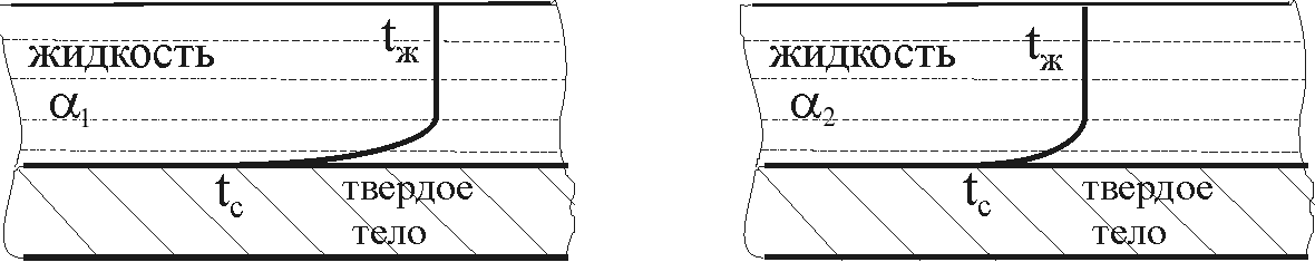24. По распределению температуры в жидкости определить: какой коэффициент теплоотдачи больше 1 или 2?