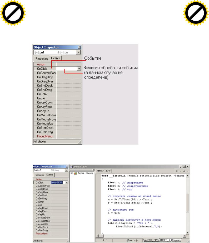 2.19). В результаті цього відкриється вікно редактора коду, в яке буде доданий шаблон функції обробки події, а у вікні Object Inspector поряд з ім'ям події з'явиться ім'я функції обробки події, що згенерувало C++ Builder (мал. 2.19).