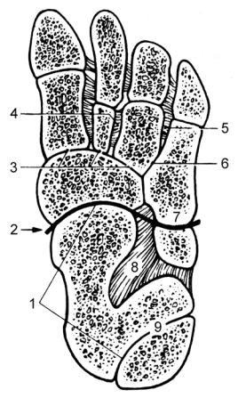 1 – articulatio talocalcaneonavicularis; 2 – articulatio tarsi transversa; 3 – articulatio cuneonavicularis; 4 – ligamenta intercuneiformia interossea; 5 – ligamentum cuneocuboideum interosseum; 6 – articulatio cuneocuboidea; 7 – articulatio calcaneocuboidea; 8 – ligamentum talocalcaneum interosseum; 9 – articulatio subtalaris.