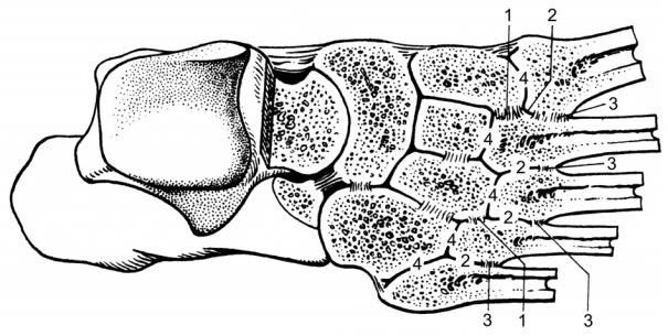 1 – articulationes intertarsales; 2 – ligamenta metatarsalia dorsalia; 3 – ligamenta tarsometatarsalia dorsalia; 4 – articulationes tarsometatarsales.