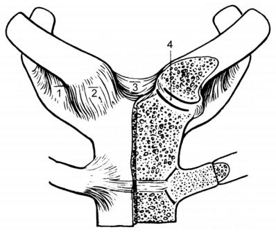 1 – ligamentum costoclaviculare; 2 – ligamentum sternoclaviculare anterius; 3 – ligamentum interclaviculare; 4 – discus articularis.