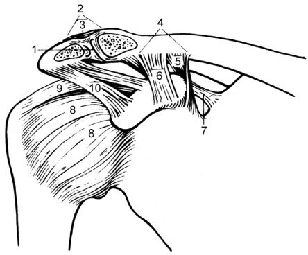 1 – discus articularis; 2 – articulatio acromioclavicularis; 3 – ligamentum acromioclaviculare; 4 – ligamentum coracoclaviculare; 5 – ligamentum conoideum; 6 – ligamentum trapezoideum; 7 – ligamentum coracohumerale; 8 – ligamenta glenohumeralia; 9 – ligamentum coracohumerale; 10 – ligamentum coracoacromiale.
