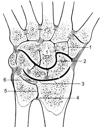 1 – articulationes intercarpales; 2 – articulatio mediocarpalis; 3 – articulatio radiocarpalis; 4 – recessus sacciformis; 5 – articulatio radioulnaris distalis; 6 – discus articularis.