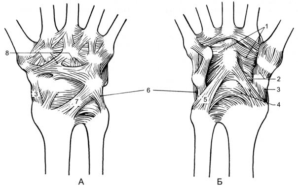 1 – ligamentum carpi radiatum; 2 – ligamenta intercarpalia palmaria; 3 – ligamentum collaterale carpi radiale; 4 – ligamentum radiocarpale palmare; 5 – ligamentum ulnocarpale palmare; 6 – ligamentum collaterale carpi ulnare; 7 – ligamentum radiocarpale dorsale; 8 – ligamenta intercarpalia dorsalia.