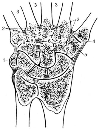 1 – articulatio ossis pisiformis; 2 – ligamenta metacarpalia interossea; 3 – spatia interossea metacarpi; 4 – articulatio carpometacarpalis pollicis; 5 – articulationes intermetacarpales; 6 – articulationes carpometacarpales; 7 – ligamenta intercarpalia interossea.